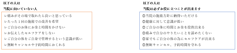 施術を受けているだけでは改善に時間もかかりますし、本当の意味での改善は出来ません。指導をさせて頂いた内容を実行された方は、確実に改善されています。指導内容はどなたでも簡単に出来るようなものしかご案内しませんのでご安心ください。
